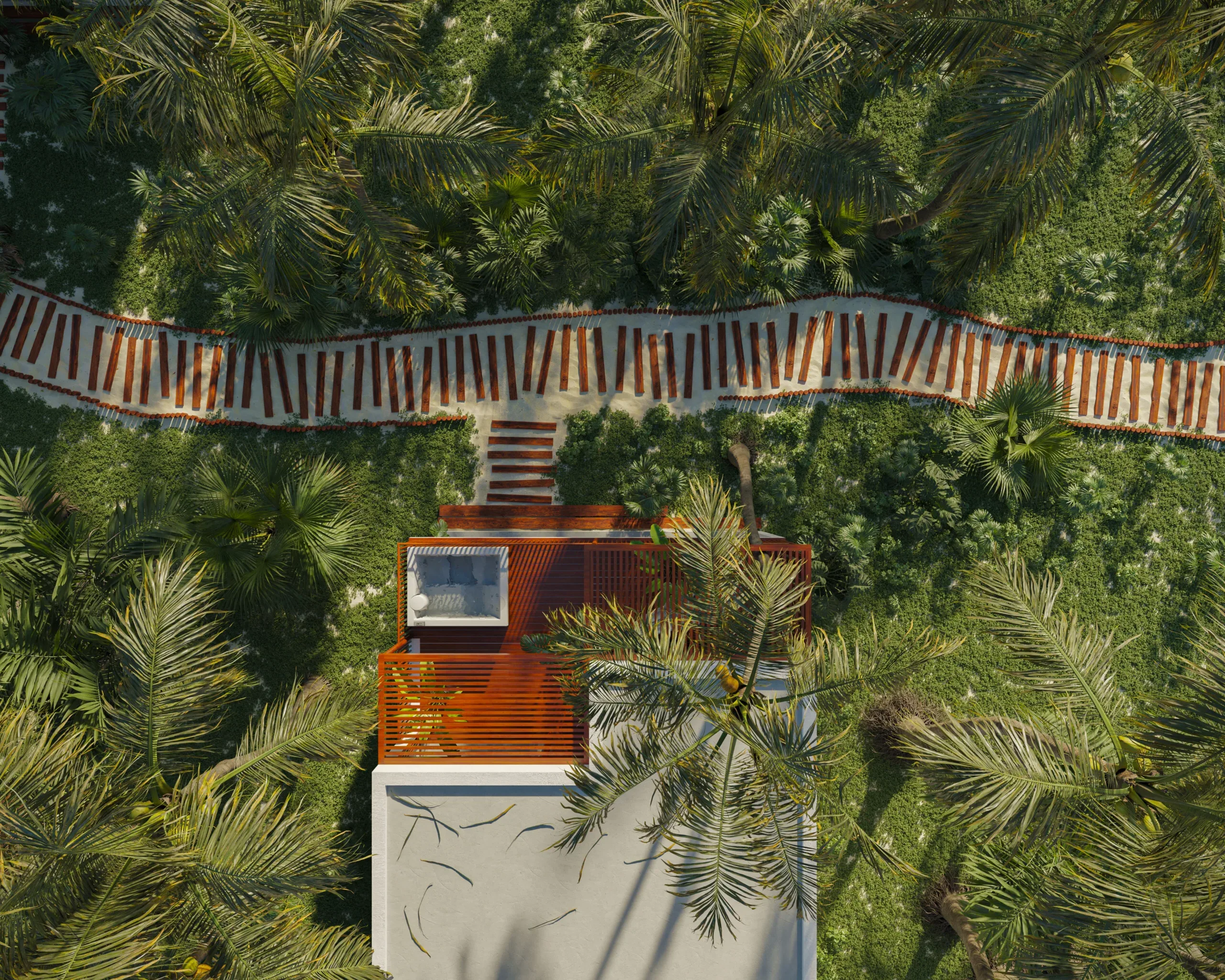 O terreno abrange 2,6 hectares repleto de coqueiros, sendo 200 metros de frente ao mar. Cada unidade foi pensada para harmonizar com o ambiente: alvenaria dobrada, detalhes em madeira e eucalipto, além de iluminação natural e ventilação contínua.
